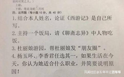 就在幾天前,河南黃河科技學院大二古代文學課期末考試的4道精心設計的開放性考題也引發了網友熱議:“結合本人姓名,論證《西遊記》是自己所寫”;“主持一個飯局請《聊齋志異》中人物吃飯”;“杜麗娘遊園,幫杜麗娘發‘朋友圈’”;“在楊玉環和李香君中選一個人,假如他們生活在今天,適合什麼職業,並説明原因”。