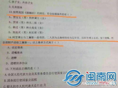 而2015年浙江大學《刑法學》(下)的一次考試中,有題目要求考生用刑法學知識分析“清風不識字,何故亂翻書”“朱門酒肉臭,路有凍死骨”等古代詩句。同年,廈大嘉庚學院《思想道德修養與法律基礎》科目期末考試中也出現“神考題”——“根據國家婚姻法,以下誰能結婚?A賈寶玉(男)和林黛玉(女);B賈璉(男)和尤二姐(女);C楊過(男)和小龍女(女);D張起靈(男)和吳邪(男)。”“阿笠博士與工藤新一是鄰居,二人因為志趣相投結為忘年交。後阿笠博士去世,留下遺囑,把全部財產送給工藤新一。以上繼承方式屬於()A.法定繼承;B.遺囑繼承;C.遺贈;D.遺贈撫養協議。”“容嬤嬤扎紫薇手指,桂嬤嬤説你這樣是違法的,這體現了法律的什麼作用?”