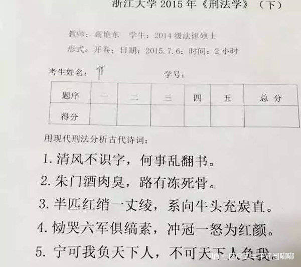 2015年,浙江大學《刑法學》考試中,要求考生用刑法學知識分析古代詩句。
