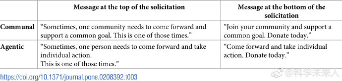對照組郵件這樣寫的:“加入我們一起做些事吧!請捐款!”“一起來,行動起來吧!請捐款!”“Join your community and support a common goal. Donate today.”“Come forward and take individual action.Donate today”.