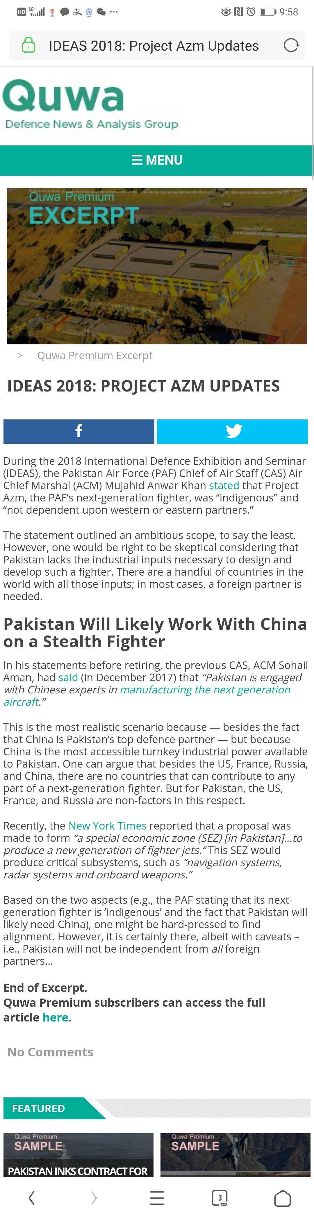 最近網絡出現這篇文章:《FC-31或已出局,巴基斯坦下一代隱身戰鬥機可能選擇魔改梟龍》,其中提到“巴基斯坦著名防務網站QUWA近日報道了該國AZM隱身戰鬥機項目的最近進展,提到巴基斯坦將在中國幫助下建立一個經濟特區,專門生產這種新一代戰鬥機。兩國將首次在巴基斯坦工廠內共同生產新戰鬥機的導航系統、雷達系統和機載武器。而此前美媒也曾報道,巴基斯坦規劃和發展部官員證實該項目將擴大中巴目前在JF-17戰鬥機方面的合作。”