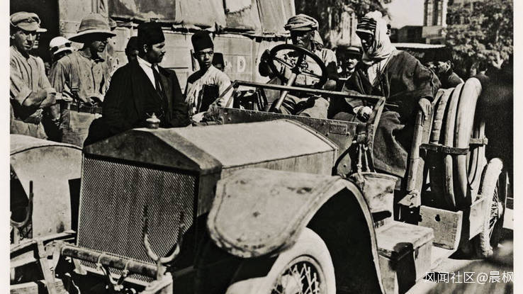 這是阿拉伯的勞倫斯(副駕座)乘坐一輛武裝化的勞斯萊斯進城