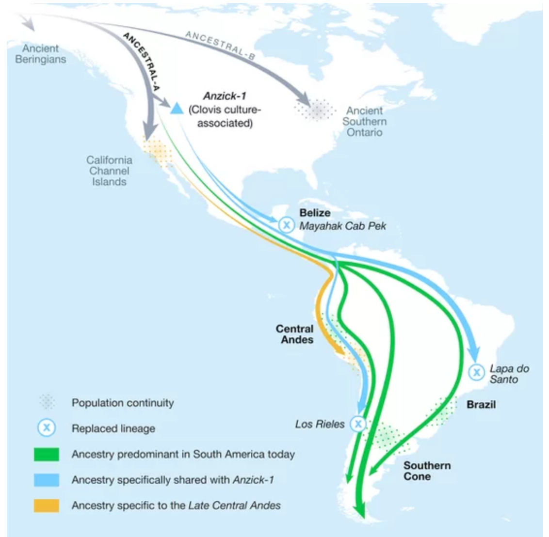 該研究顯示直到9000年前,該地區人類的DNA遺傳自北美克洛維斯文化。 然後在9000年前時,發生了一些事情,導致了中美洲和南美洲的人口膨脹,新的人口似乎並不是北美克洛維斯文化的後代。 人口替代的發生方式和原因是一個謎。