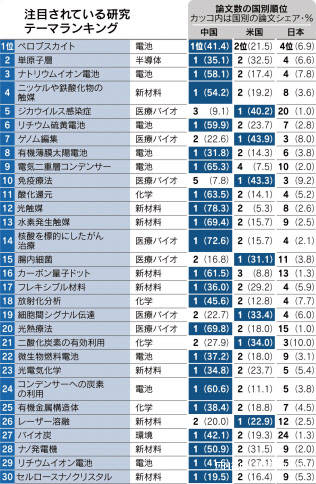 日本經濟新聞和荷蘭的研究機構愛思唯爾共同對2013~18年間愛思唯爾擁有的學術雜誌的論文數據進行分析。根據查閲次數等將論文的引人注目進行得分,然後對各研究課題進行統計。得出最高分數的30個研究課題。總共統計了1720萬件論文,其中中國約290萬件、美國約390萬件、日本約77萬件。
