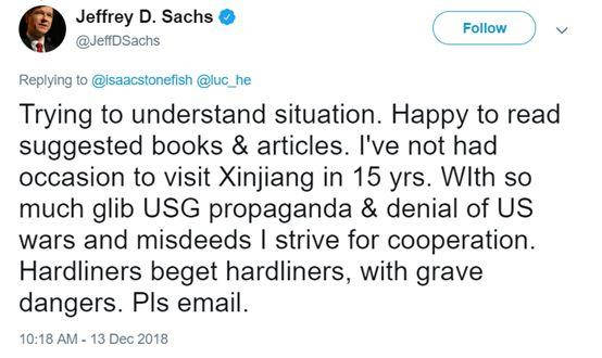 然而薩克斯回應説,他是想了解新疆的實際情況,但不想【被美國政府的“宣傳”和“雙標”所誤導】: