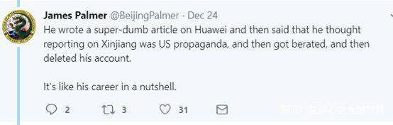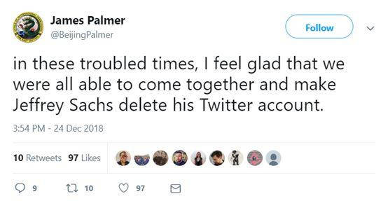 而《外交學者》雜誌的編輯James Palmer更是“毫不遮掩”地為這種“言論迫害”而叫好,稱“我很高興我們終於趕走了薩克斯,逼得他刪掉了他的社交賬號。”