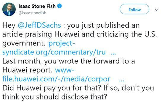 他的這篇文章自然引起了美國各種反華勢力的痛恨。比如下圖中這個給《華盛頓郵報》等媒體撰稿的“反華學者”Issac Stone Fish就對薩克斯展開了人身攻擊,“指責”他是拿了華為的錢才這麼説話: