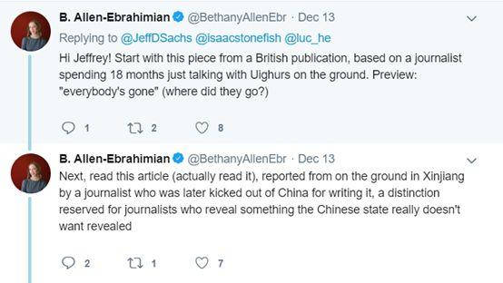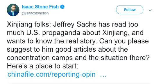 這番回應自然又觸怒了那個Isaac。他立刻發帖糾集了一羣反華媒體人乃至恐怖組織“東突”的支持者跑去騷擾薩克斯,給薩克斯發去了大量西方媒體發佈的與美國政府立場一致的新疆虛假信息: