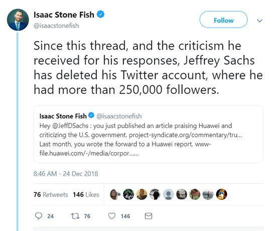 比如,那個反華學者Isaac就宣稱是他質疑薩克斯收了華為錢的帖子令薩克斯羞愧地刪掉了自己賬號。