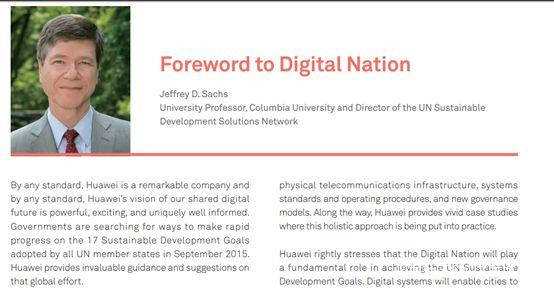於是,在華為公司於今年11月發佈的《數字國家:促經濟、保福祉、善治理》的報告中,薩克斯就親自給該報告作序,認為華為的“數字國家”計劃將“推動各國可持續發展”。