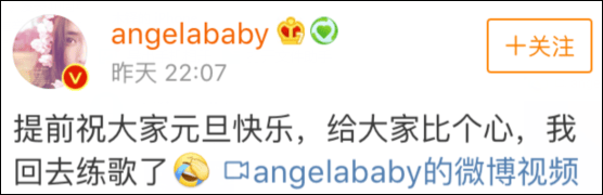 以上是昨天晚上浙江衞視晚會的節目單。其中有一名嘉賓叫Angelababy,她還在昨晚發了微博: