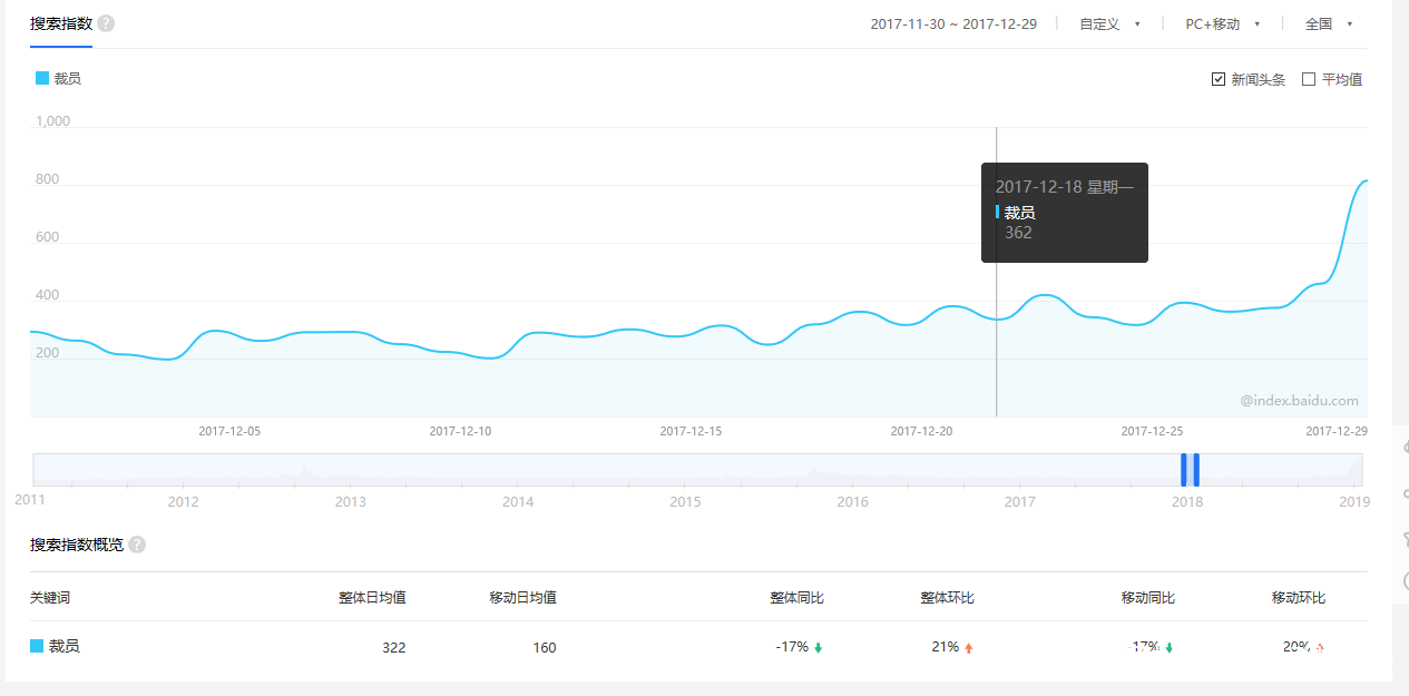(同比2017年 “裁員” 關鍵詞 百度指數)