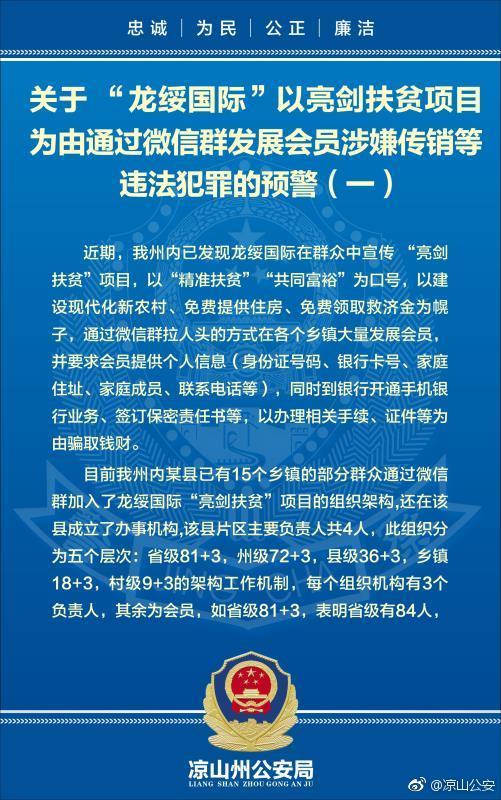 四川涼山公安預警:“龍綏國際”以亮劍扶貧為由涉嫌傳銷 2018-01-16 四川省涼山彝族自治州公安局官方微博@涼山公安1月16日發出預警消息稱,“龍綏國際”以亮劍扶貧項目為由通過微信羣發展會員涉嫌傳銷等違法犯罪。 圖片來源:微博@涼山公安