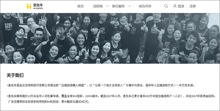 據觀察者網查詢“皇包車”APP官網,原旅遊業從業人員孟雷2013年成立了“北京純粹旅行有限公司”,並推出手機應用“皇包車”,該公司希望“搭建一個平台,讓所有想出去玩的中國人能通過這個平台找到世界各地會講中文的朋友,讓旅居海外的華人帶着大家去感受不一樣的旅途風光。”