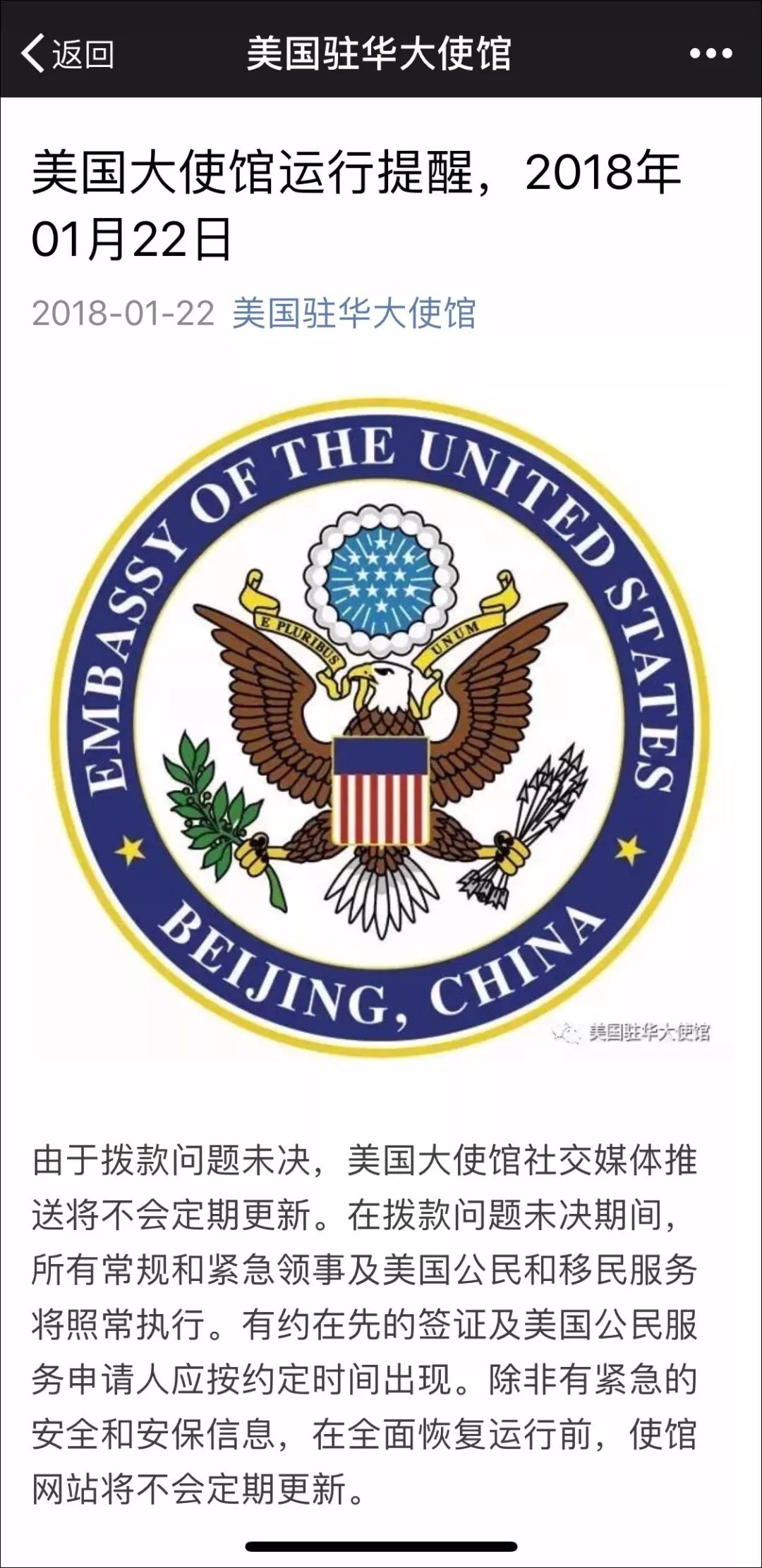 今天,美國駐華大使館官方網站發佈運行提醒,稱由於撥款問題未解決,雖然所有常規和緊急領事及美國公民和移民服務照常執行,但社交媒體推送不會定期更新。