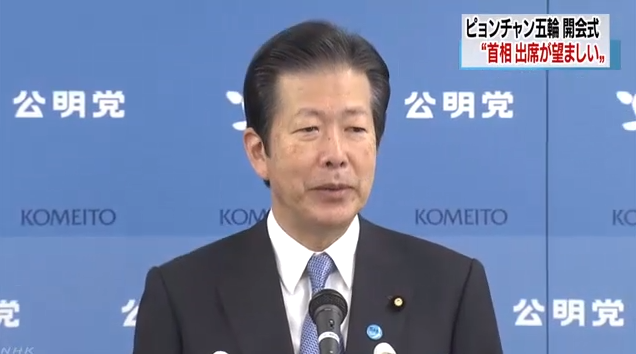18日,公明黨黨首山口那津男表示“期待安倍出席”(NHK新聞報道截圖)
