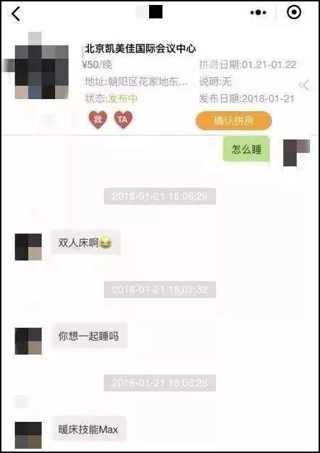 新京報的記者也直接試驗了這款所謂“異性拼房”的項目,記者發現,“一些拼房者的目的則並不單純,甚至直接提出非分要求。其中,一名定位在朝陽區,通過系統認證的男性拼房者,在聊天開始後就直接提出:直接説吧,不閒聊了”,甚至有人還稱自己有“暖牀技能”。這些頗具性暗示意味的話語,雖然是某些用户提出的,但也和小程序提供的環境有關。