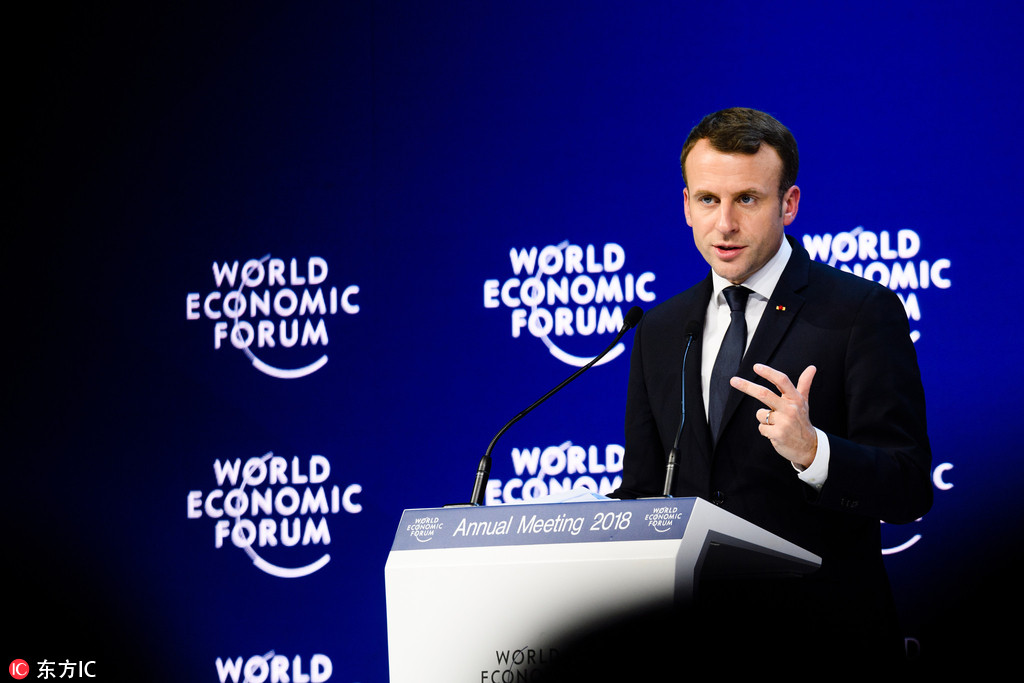 當地時間2018年1月24日,瑞士達沃斯,法國總統馬克龍參加達沃斯世界經濟論壇。 圖/東方IC