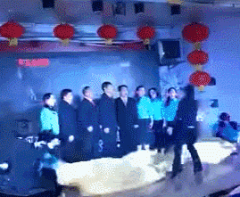 節目中參賽選手伴着《黃河大合唱》的背景音樂,做出一些誇張另類的肢體動作,當時這段表演引得現場四位評委大笑,並獲得全票通過。