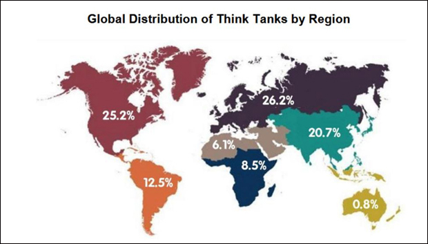 據科學網2月13日報道,日前,最具權威性的全球智庫排名報告——美國賓夕法尼亞大學“智庫研究項目”(TTCSP)研究編寫的《全球智庫報告2017》(下稱《報告》)正式對外發布。《報告》指出,全球共有7815家智庫,其中北美洲智庫1972家,歐洲擁有2045家,全球接近51.4%的智庫機構在北美洲或歐洲運營。在最近12年,美國及歐洲的新興智庫增長率正逐步下降,與此同時亞洲、拉丁美洲、非洲、中東以及北非的智庫數量出現較為迅速增長的趨勢。其中,亞洲緊隨歐洲和美洲之後,擁有1676家。