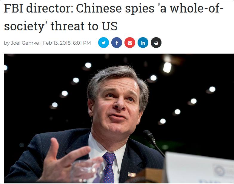 【觀察者網 綜合報道】“中國間諜佈滿了全美……這是整個美國社會所面臨的威脅……需要全社會共同面對。”2月13日,美國聯邦調查局(FBI)局長克里斯托弗·雷(Christopher Wray)在參議院情報委員會的聽證會上這樣形容來自中國的“間諜威脅”。