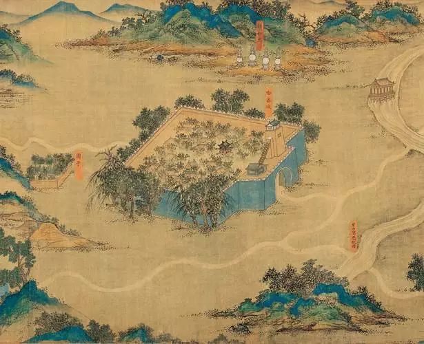 從視覺藝術的角度欣賞,這幅地圖由宮廷畫家以明代中葉吳門畫派風格的青綠山水技法繪製而成,可稱是古代千里江山圖的典範。