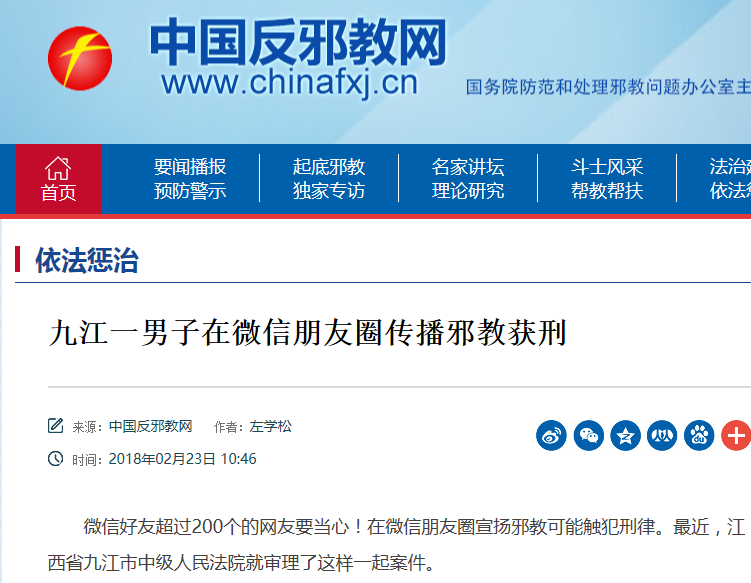 據中國反邪教網報道,近日江西九江一“法輪功”人員因在微信朋友圈中傳播散佈邪教信息,被判處有期徒刑四年。中國政府處理邪教的政策是,教育挽救絕大多數,依法打擊極少數,但這絕不意味着,突破法律底線的人可以不受到法律的懲處。