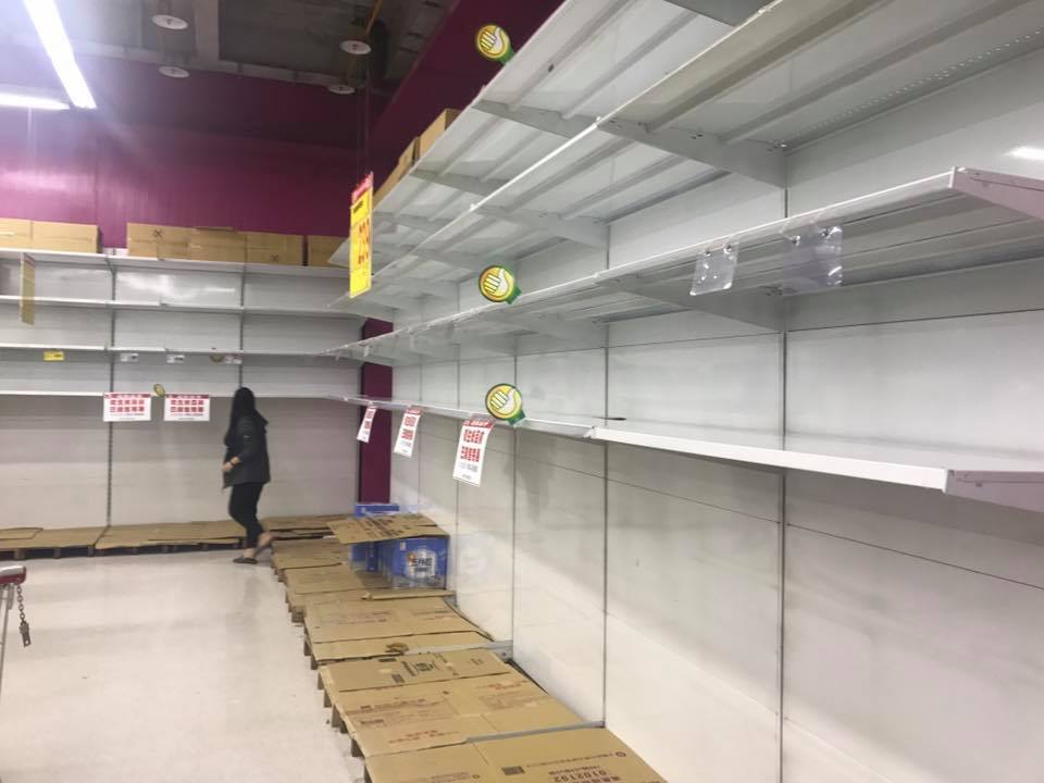 在雲林縣,超市衞生紙被搶購一空,銷量較以往增長10倍。買不到衞生紙的民眾乾脆站在貨架前等待工作人員鋪貨,“為什麼還不鋪貨”的抱怨聲連連;一見工作人員鋪貨,未待包裝拆除,民眾就五六箱一起往購物車裏搬,“能搶到一包是一包”,貨架瞬間被搬空。