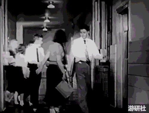 年紀大一點的學生們下課到了走廊,附近核爆,迅速集體縮到牆角。