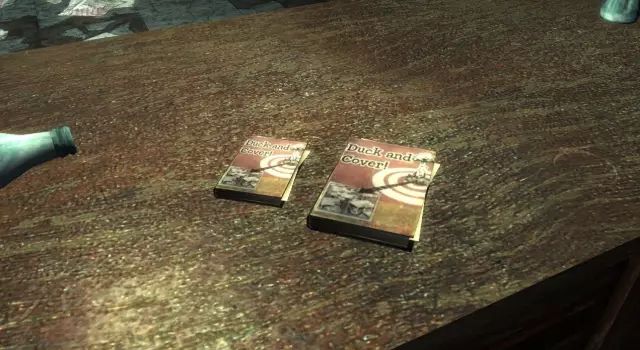 這本書名叫《Duck and Cover!》,直譯就是“卧倒並掩護”的意思,《輻射3》裏的讀盤畫面偶爾也會出現這本書,能清楚地看到一羣鑽在書桌下的學生,試圖躲過遠處的核爆。