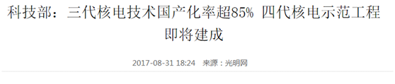 我們以核電為例,2017年8月31日,在科技部舉行的核電專項新聞發佈會上,國家能源局核電司副司長、核電重大專項實施管理辦公室負責人秦志軍介紹説,我國三代核電技術國產化率總體達到85%左右。