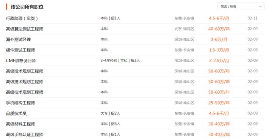 下圖為OPPO公司2018年2月份發佈在前途無憂網站的職位,全部明確的寫着薪資範圍,可以感受一下,例如CMF創意設計師,也就是負責OPPO手機表面的顏色,材料和處理的設計師,要求本科3年經驗,薪資2-2.5萬/月,注意這個工資不包括年終獎。