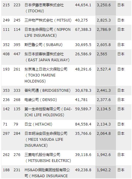 格力的淨利潤2017年超過200億人民幣應該沒有問題,按照6.75的匯率就是29.63億美元,這是個什麼水平呢,下圖是《財富》2017年世界五百強裏面的日本公司,我們按照淨利潤排名,格力可以排在日本所有企業第12位。