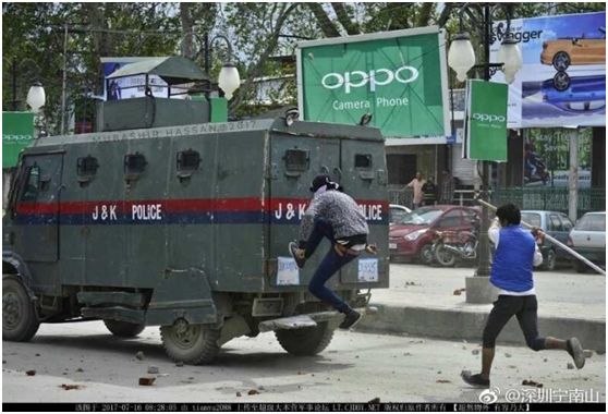 2017年7月,我看到一張南亞克什米爾衝突的新聞圖片,背景就有OPPO的手機店和海報。