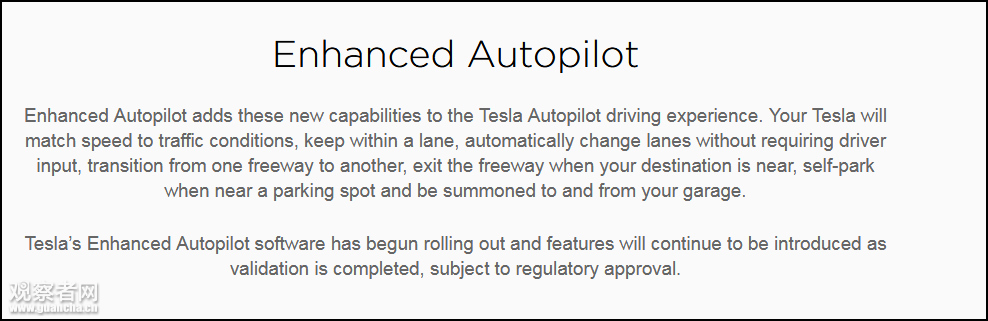 目前特斯拉英文與中文官網信息,Enhanced Autopilot被翻譯為“增強版自動輔助駕駛”。