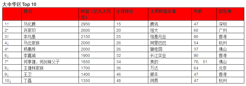 在大中華區的十大富豪中, 47歲的馬化騰財富2950億元正式成為全球華人首富,他是胡潤百富榜創立以來第13位中國首富。許家印財富2600億元位列大中華區第二,全球第20位。馬雲及其家族財富 2000億元位列大中華區第四,全球第26位。