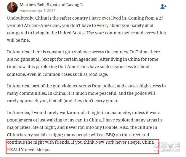而這遠遠不足以反映Quora上此類話題受關注的程度,類似話題層出不窮。觀察者網小編在細心翻閲數百條回答後發現,雖然有些外國網友可能會對中國的環境、食品、個體攤販的誠信、小偷小摸等問題懷有顧慮,但是沒有一個人認為,“中國總體上是不安全的”。