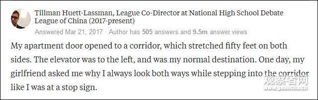這名網友説來中國前,自己在樓道里,有左右看的習慣