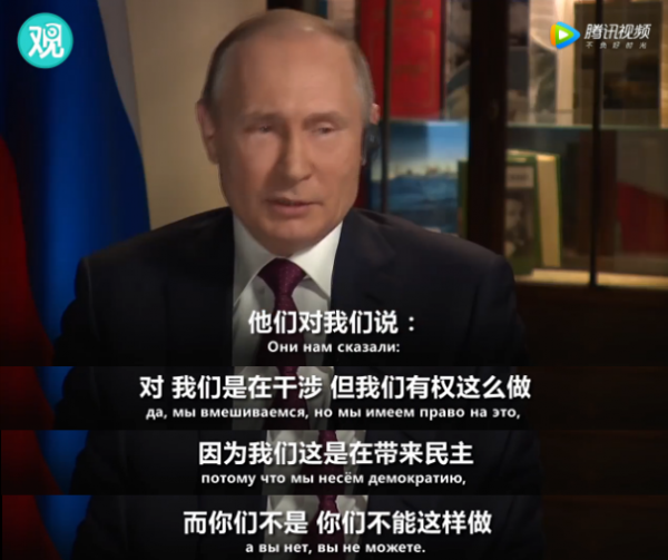 對於梅根·凱利喋喋不休的追問,普京提起不久前與美國高層的一次對話。美國人毫不否認自己干涉俄羅斯政治,並且理直氣壯地説:“我們是在傳播民主。”