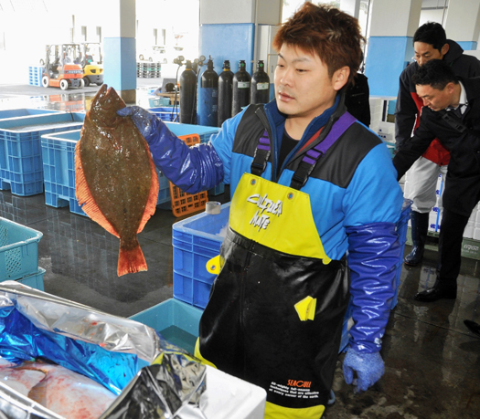 福島縣相馬市,漁民將捕撈上來的褐牙鮃裝箱(河北新報 圖)
