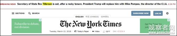 【觀察者網綜合報道】3月13日,美國總統特朗普突然在推特上宣佈,解除國務卿蒂勒森的職務。