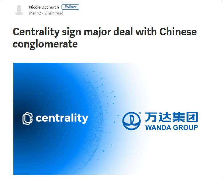 澎湃新聞3月12日報道,總部位於新西蘭的區塊鏈公司Centrality NZ公司當日宣佈,萬達網絡科技集團與Centrality NZ公司開展了戰略技術合作。此次合作不涉及投融資,第一階段主要是雙方的技術合作,研發推廣Centrality的開源公鏈技術PL^G在主要場景的應用落地;在技術集成後會雙方期望會有更多的開展用户圈、商圈的合作,即生態系統的打造。