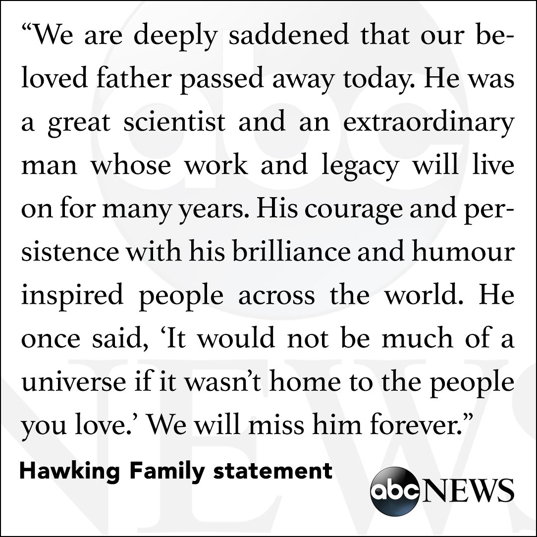 霍金子女露西、羅伯特和蒂姆在英國新聞協會通訊社發表的聲明中稱:“我們非常沉痛地告知大家,我們深愛的父親在今天離開了我們。他是一位偉大的科學家也是一位傑出非凡的人物,他的成就和傳奇將在多年後依然傳世。他的勇氣與堅持、他的才華和幽默激勵了全世界的人們。他曾説過:‘如果宇宙不是你所愛之人的家園,那它也不過如此。’我們會永遠想念他。”