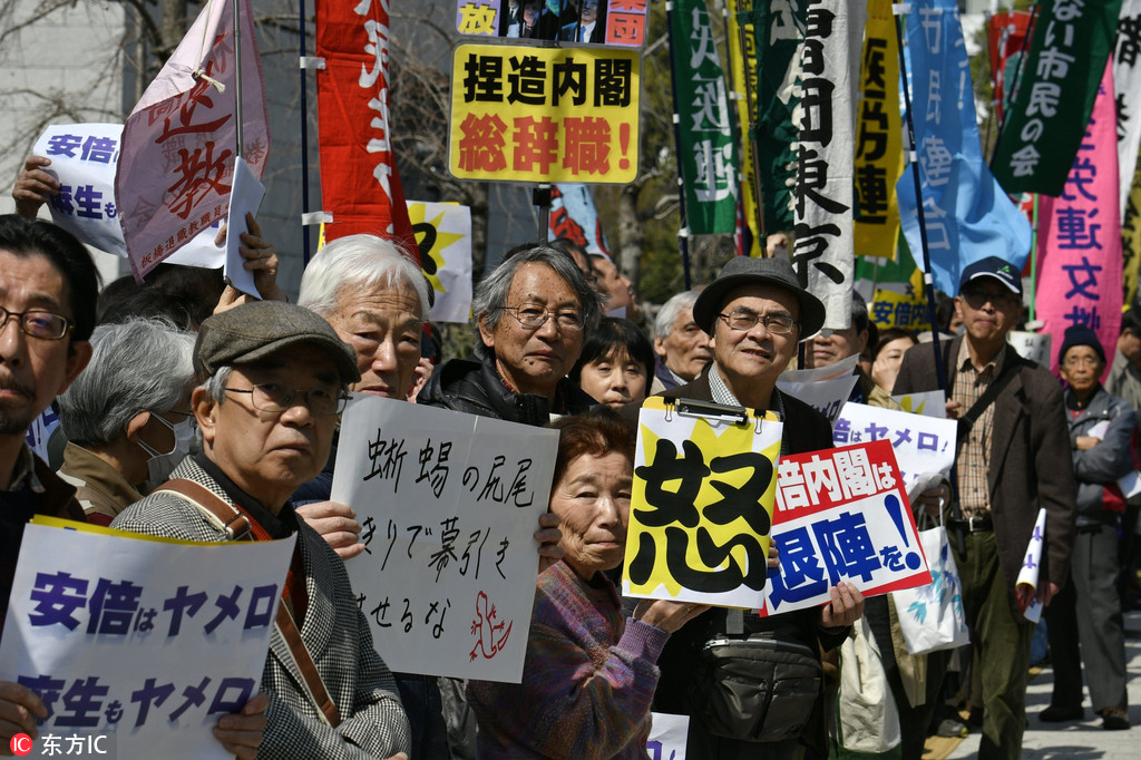 當地時間3月13日,日本東京,日本民眾在國會附近示威抗議,要求首相安倍晉三下台。(圖/東方IC)