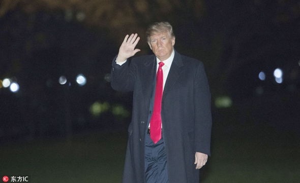 美國當地時間3月10日晚間,特朗普踱步走回白宮時,向守候的記者們打招呼(@東方IC)