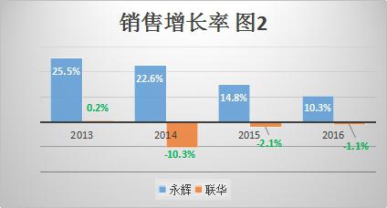 數據顯示,聯華銷售額由2013年的688.2億,下降到2016年的597億,增長為負-13.2%。永輝銷售額由2013年的350.6億,增加到2016年的544.1億,增長55.2%。