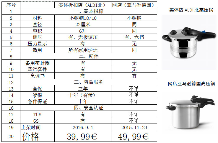 剩下的就是堅持了。從1952年到今天,半個多世紀過去,商品和科技發生了天翻地覆的變化,對於阿爾迪來説萬變不離其宗,始終堅持零售初心不變,並得到了豐厚回報。今天,與電商相比,阿爾迪的價格仍然有着不可忽視的優勢。不信?請看一個德國市場上高壓鍋價格比較例子:阿爾迪PK電商亞馬遜。