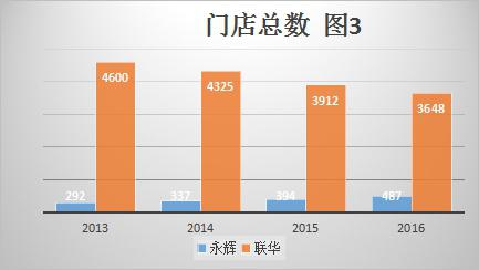 聯華門店數由2013年的4600家,減少到2016年的3648家,增長-20.7%。永輝由2013年的292家,增加到2016年的487家,增長66.8%。