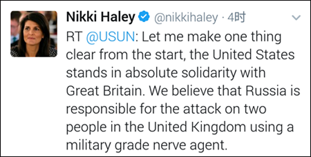 美國常駐聯合國代表妮基·黑莉(Nikki Haley)發言稱,“美國是絕對站在英國一邊的。美國認為俄羅斯要對在英國使用軍事級的神經毒劑負責。”黑莉説:“俄羅斯在所有這些危險和破壞穩定活動中的作用正使各國日益憂慮,俄羅斯作為安理會常任理事國應負起責任,充分配合英國調查。”