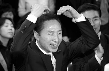 2007年,李明博在保守派政黨大國家黨的初選中戰勝朴槿惠,並最終當選韓國總統,成為首位商界出身的韓國總統,“平民神話”達到頂峯。